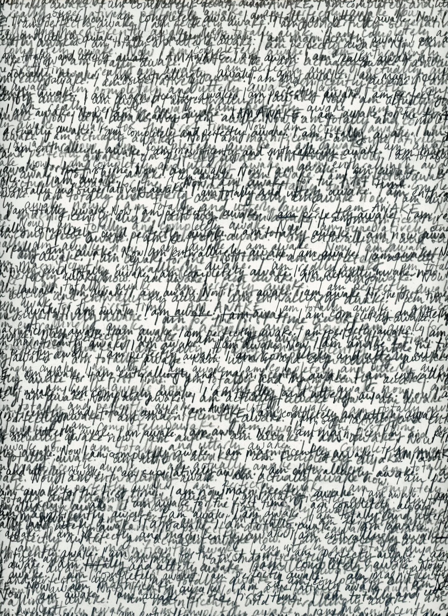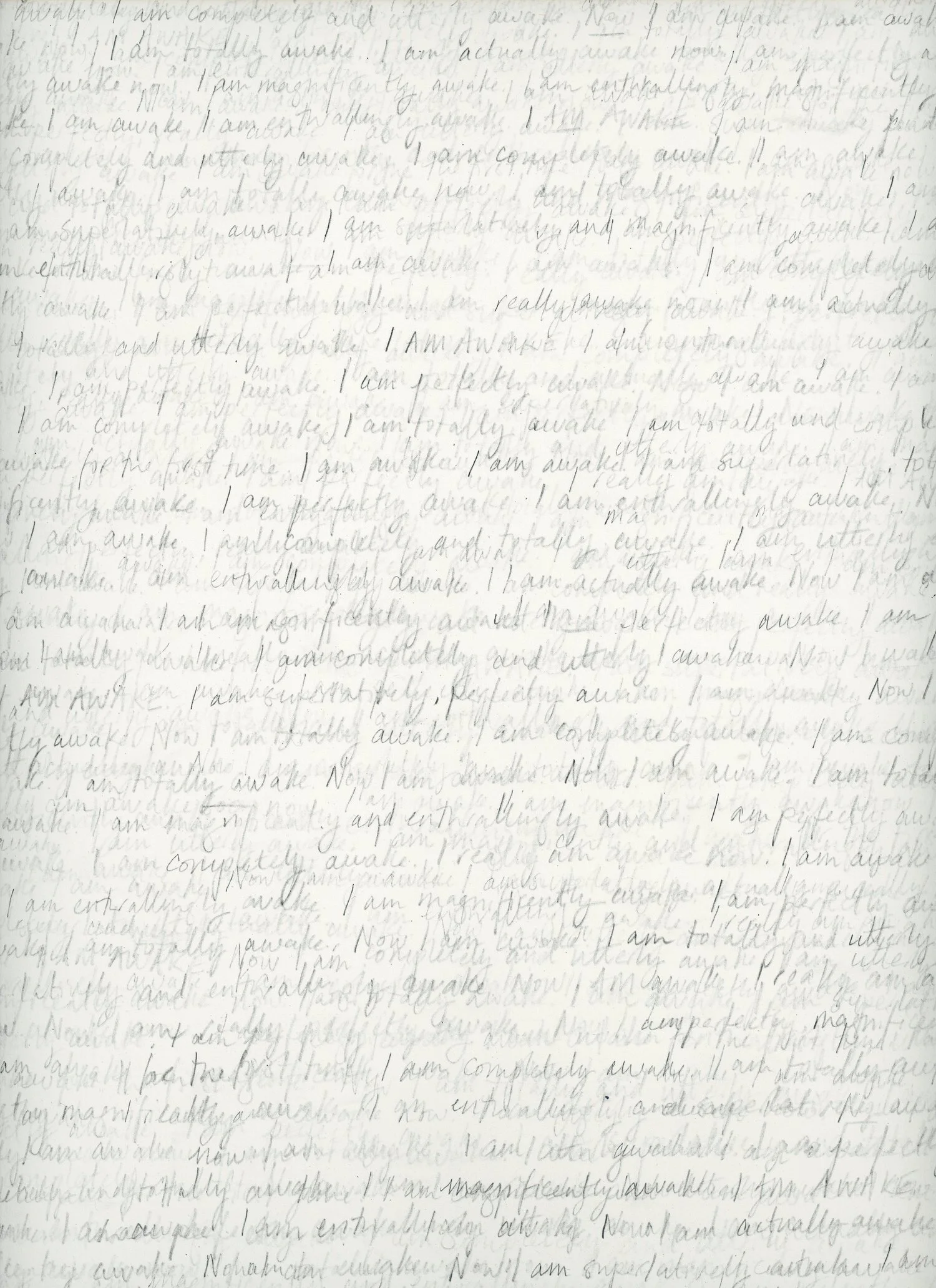 Superlatively Awake (series of drawings): The piece is inspired by the diary of Clive Wearing, the English Musicologist who suffered from amnesia so severe that he could remember nothing for more than 30 seconds. He kept a diary consisting of nothing but variations on the same phrase, repeated and crossed out endlessly. Despite this handicap, he could still play piano and conduct music, retaining the implicit memory that he had built up over a lifetime even if he no longer had any explicit memory. Likewise, the drawings in Superlatively Awake slowly build up an implicit figuration of a half-remembered figure, obscured by the endless repetition but not diminished. Part of the research conducted at the Tetley with Leeds University in 2019 on language and memory