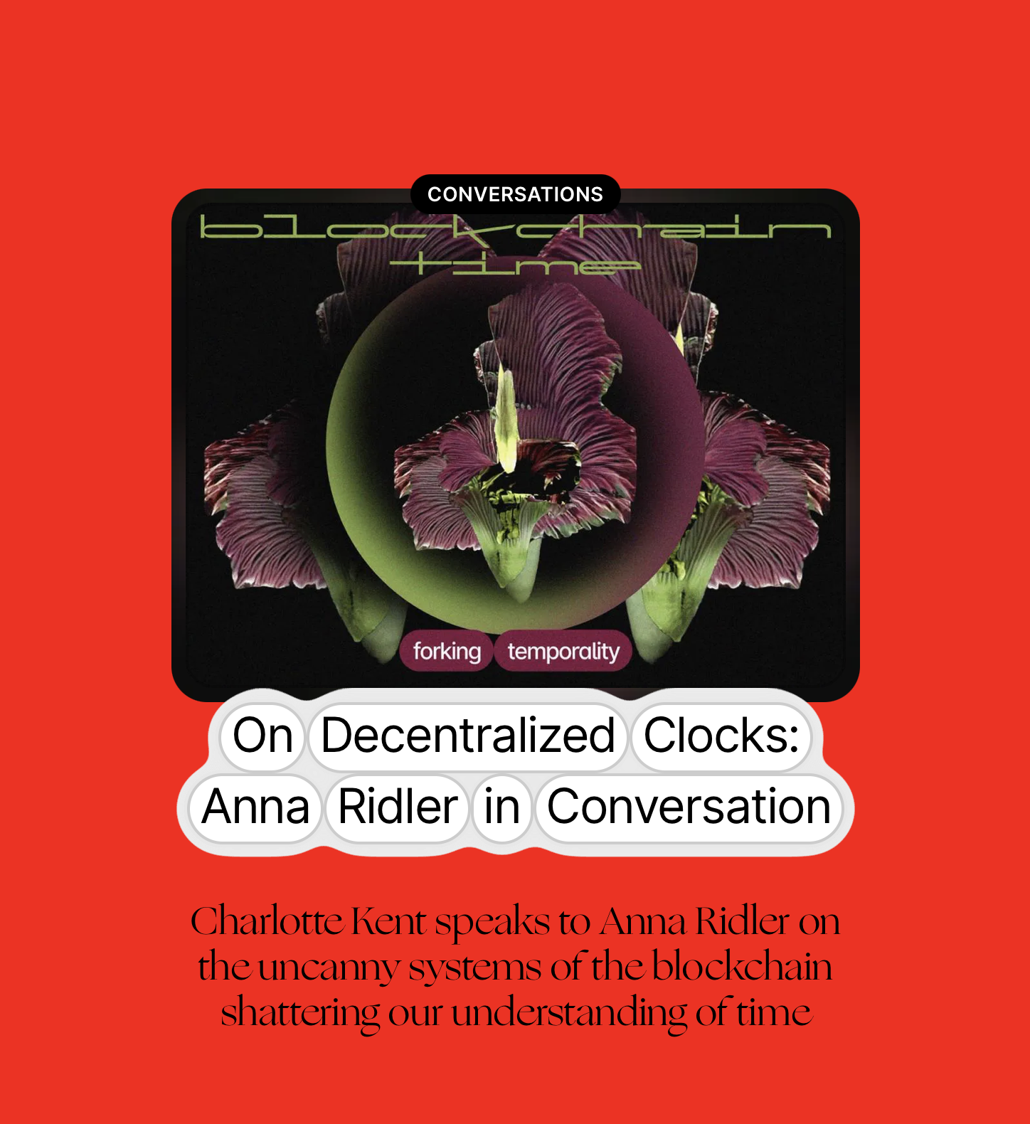 Charlotte Kent speaks to Anna Ridler on the uncanny systems of the blockchain shattering our understanding of time. Blockchain's rhetoric of immutability introduces a sense of things unchanging: a fixed past, an enduring present, and a reliable future. But that's not the affective sense of blockchain's temporality. It's exhaustingly fast, excitingly new, and presents an infrastructure completely disconnected from other time systems—calendrical, mechanical, or Unix-based.